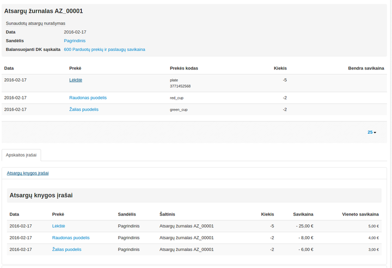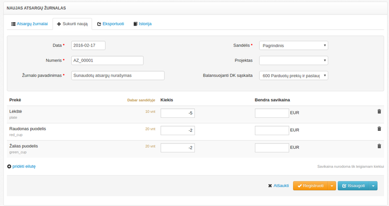 Užregistravus žurnalą sistema sukuria atsargų knygos įrašus