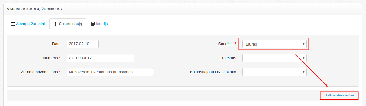 2. Užpildoma žurnalo antraštė (kad sistema žinotų kokio sandėlio likučius imti)