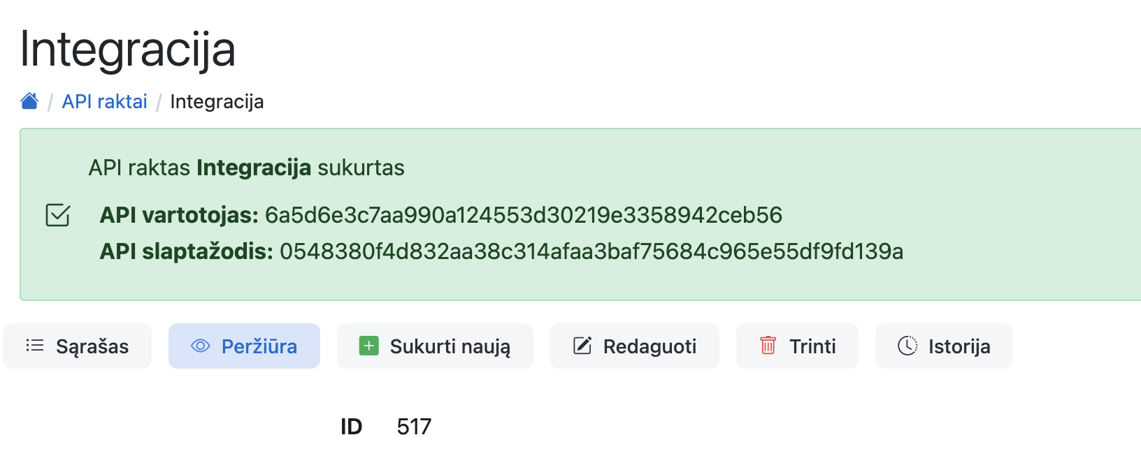 Dėmesio - sukūrus API raktą, sistema jums sugeneruos API vartotojo vardą ir slaptažodį. Slaptažodis bus rodomas tik vieną kartą po sukūrimo. Jei slaptažodį pamiršite nusikopijuoti, raktą ištrinkite ir susikurkite naują.
