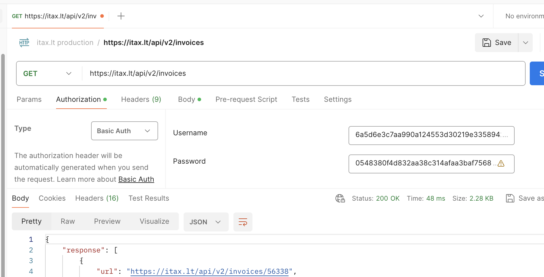 curl -H 'Authorization: Basic < base64 užkoduotas API vartotojas ir slaptažodis >' https://itax.lt/api/v2/invoices