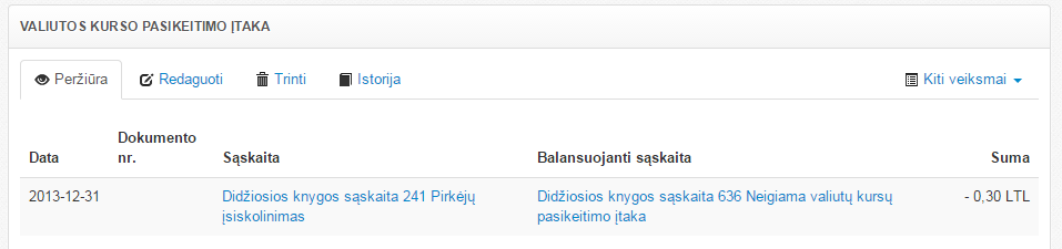 Valiutos kursų pasikeitimo įtaka yra registruojama automatiškai "uždarant" (įvedant sąskaitų apmokėjimą) valiutines pozicijas.