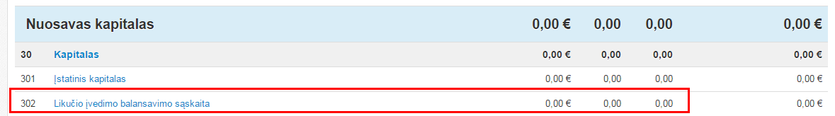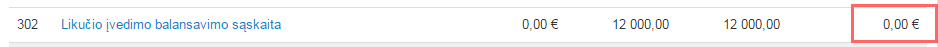 2. Suvedus visus tiesioginio registravimo sąskaitų likučius, pasirenkama Likučių įvedimo balansavimo sąskaita ir joje įvedama atitinkama suma, kad žurnalo bendra suma būtų lygi 0.