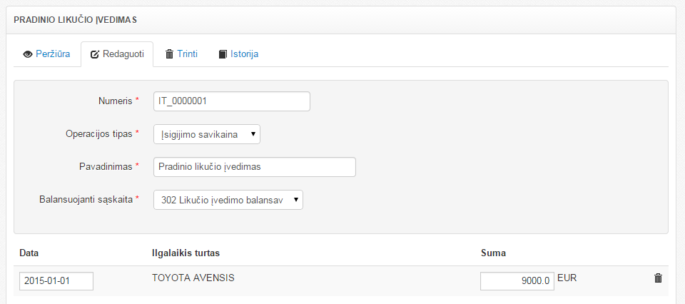 Likutis įvedamas per Ilgalaikio turto žurnalą.Įvedama likutinė nenudėvėta turto vertė.
