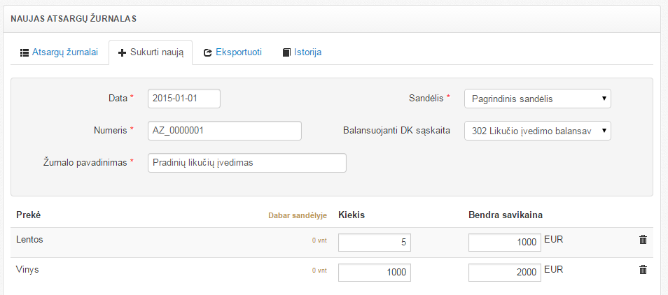 Atsargų likučiai įvedami per Atsargų žurnalą.