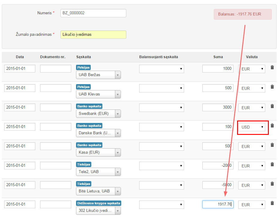 Jei likutis yra užsienio valiuta, tai šia valiuta ir turi būti įvedamos sumos kaip parodyta pavyzdyje.