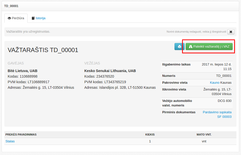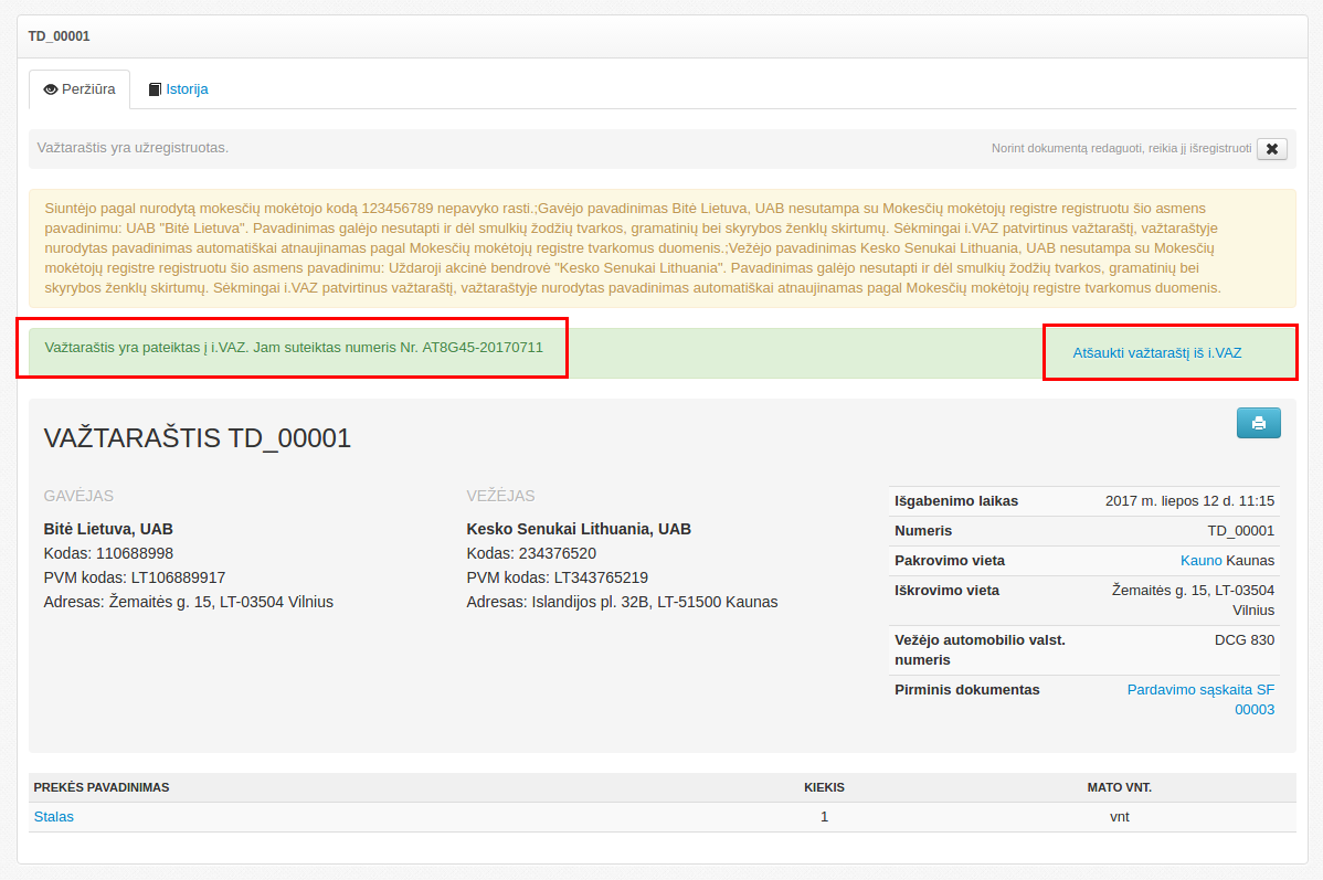 Jei pateikimas į i.VAZ buvo sėkmingas, sistema parodo atitinkamą pranešimą su VMI sistemos suteiktu važtaraščio numeriu.