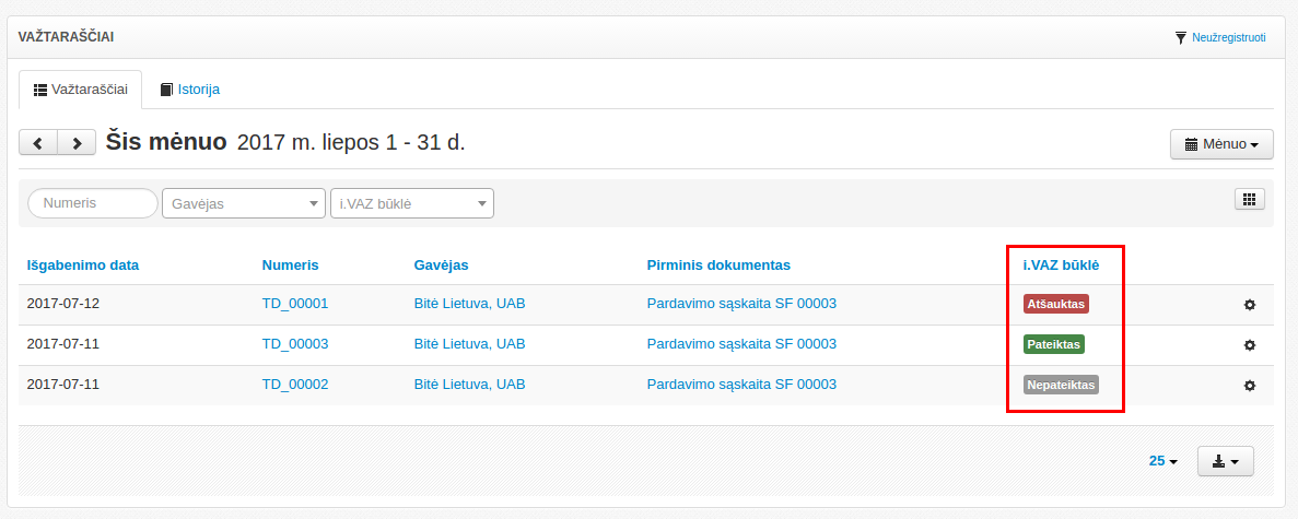 Dėmesio. Šios būklės atitinka faktą jei važtaraščiai yra pateikiami naudojantis žiniatinklio paslaugomis. Jei važtaraščius eksportuojate į xml failą ir teikiate rankiniu būdu, būklė visada bus "Nepateiktas". Taip pat gali skirtis važtaraščių būklės, jei jūs važtaraščius redagavote tiesiai i.VAZ sistemoje.