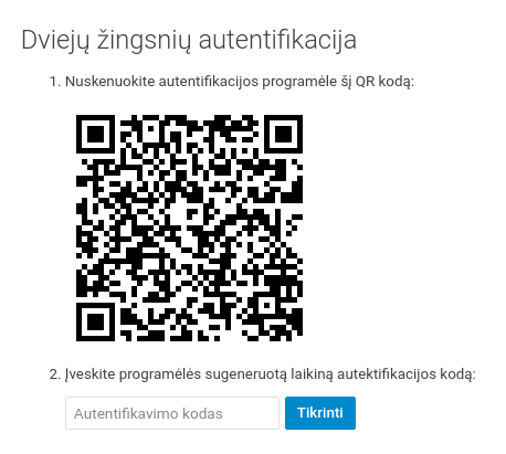 Naujame lange yra parodomos QR kodas. Jį reikia nuskenuoti telefono autentifikacijos programėle (pvz. Google Authenticator). Programėlės sugeneruotą kodą reikia įvesti į atitinkamą lauką ir patikrinti ar susiejimas su telefonu sėkmingai pavyko.