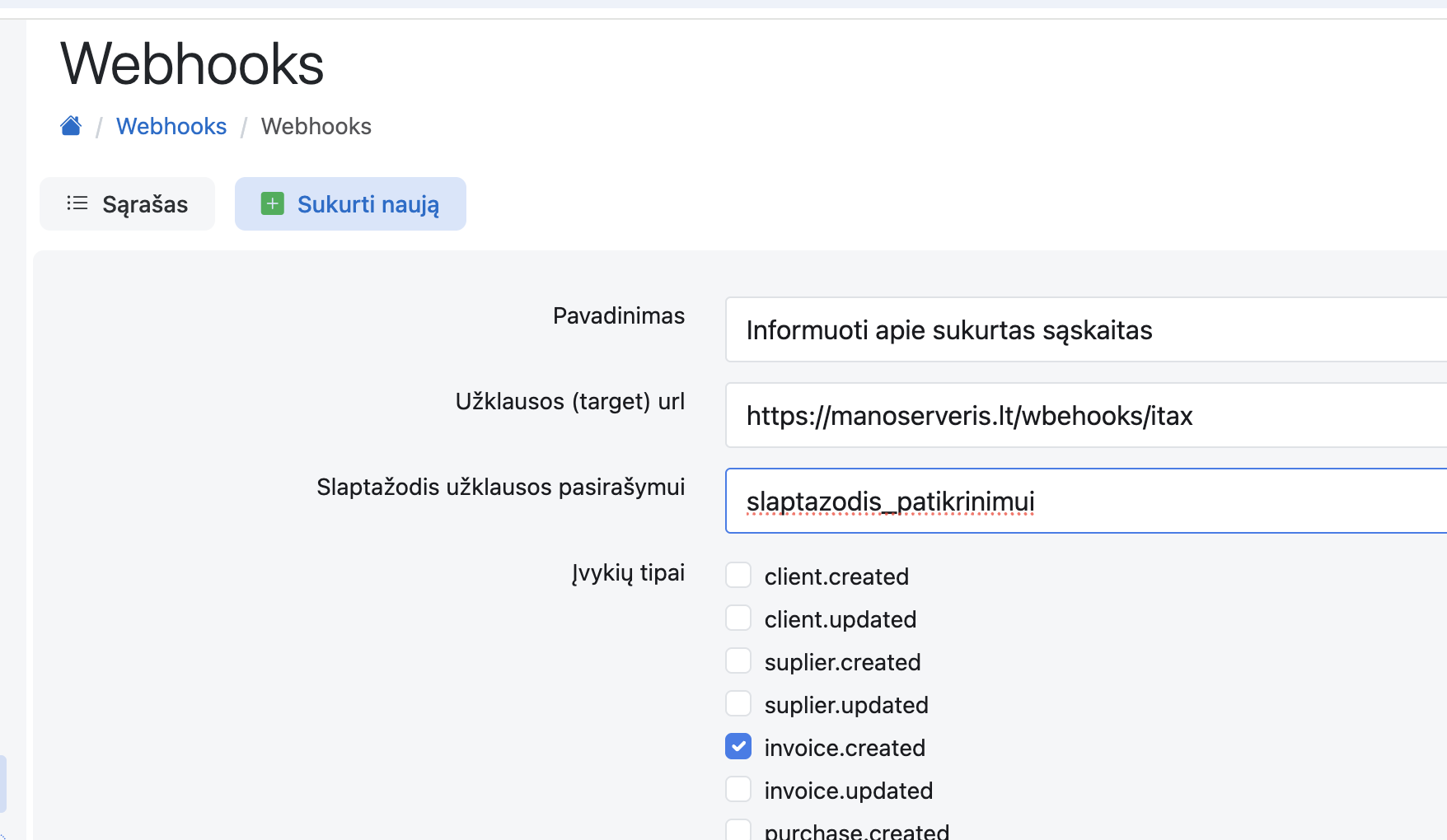 Webhook’ai skirti automatiškai pranešti jūsų sistemai apie svarbius įvykius (pvz., sukurtas/atnaujintas klientas, sąskaita, užsakymas, CRM įrašas ar pasikeitęs produkto kiekis).
