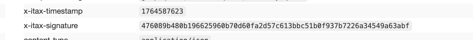 Kiekvienoje užklausoje itax siunčia antraštes X-Itax-Signature ir X-Itax-Timestamp.