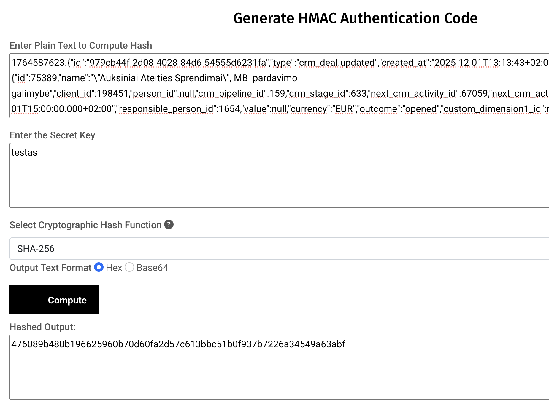 Čia vaizdingiau galite pamatyti ir pabandyti https://www.devglan.com/online-tools/hmac-sha256-online