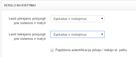 Dėmesio - jei pastarasis nustatymas aktyvuotas, o Pirkėjo/Tiekėjo kortelėje nėra nurodytas el. pašto adresas, vartotojas negalės prisijungti prie sistemos, kol neįvesite nurodyto el. pašto adreso.