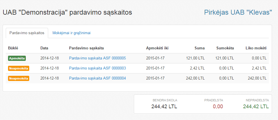 Savo klientui galite suteikti galimybę ne tik peržiūrėti konkrečią sąskaitą, bet ir visas jam išrašytas sąskaitas bei gautus mokėjimus. Beje, panašią informaciją galite pateikti ir savo tiekėjui, taip lengvais suderinsite skolos likučius ar kilusius nesusipratimus.