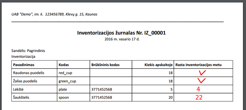 Suskaičiuojamo sandėlyje esančios prekės ir faktiniai likučiai sužymimi inventorizacijos dokumente.