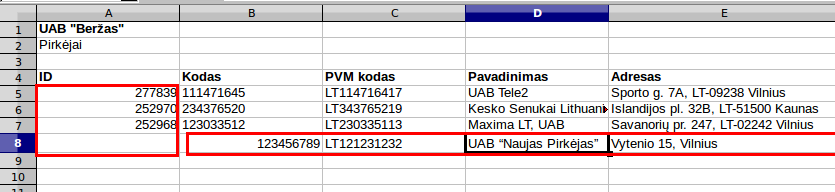 Sistema, importuodama duomenis, juos tikrins pagal ID stulpelį, t.y. jei ID yra užpildytas bus ieškomas atitinkamas Pirkėjas (ar kitas duomo) su tokiu ID sistemoje ir pagal jį bus atnaujinami duomenys. Jei ID importo faile nėra užpildytas, vadinasi bus kuriamas naujas Pirkėjas su eilutėje nurodytais duomenimis.