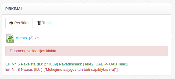 Jei duomenys nepraėjo patikrinimo ir jame buvo rasta klaidų, sistema neleis tokių duomenų importuoti į sistemą. Jūs turite ištaisyti nurodytas klaidas (dažniausiai tai būna neužpildyti privalomi duomenys) ir iš naujo pateikti failą importui. Įkeltą importo failą su klaidomis iš sistemos galite ištrinti.