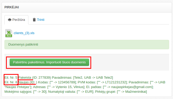 Jei duomenys sėkmingai praėjo patikrinimą, vartotojas turi patvirtinti importo užbaigimą, kad pakeitimai atsirastų sistemoje. Visi pakeitimai yra surašyti importo ataskaitoje. Joje matysite kokie laukai bus pakeisti bei naujas jų reikšmes.