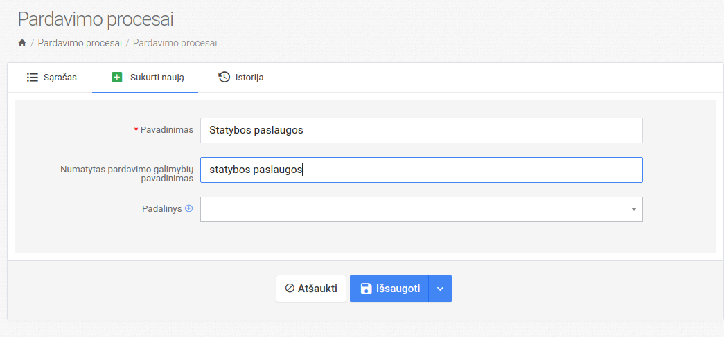 CRM -> Nustatymai -> Pardavimo procesai -> Sukurti naują