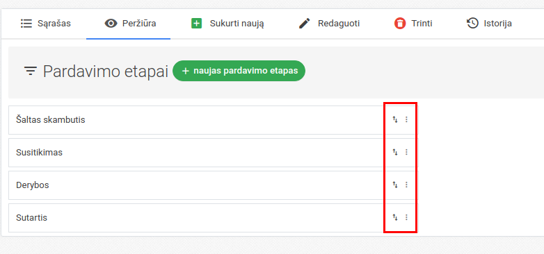 Pardavimo proceso etapų eiliškumą galima pakeisti juos tempiant pele aukštyn - žemyn. Paspaudus taškelius juos galima redaguoti.