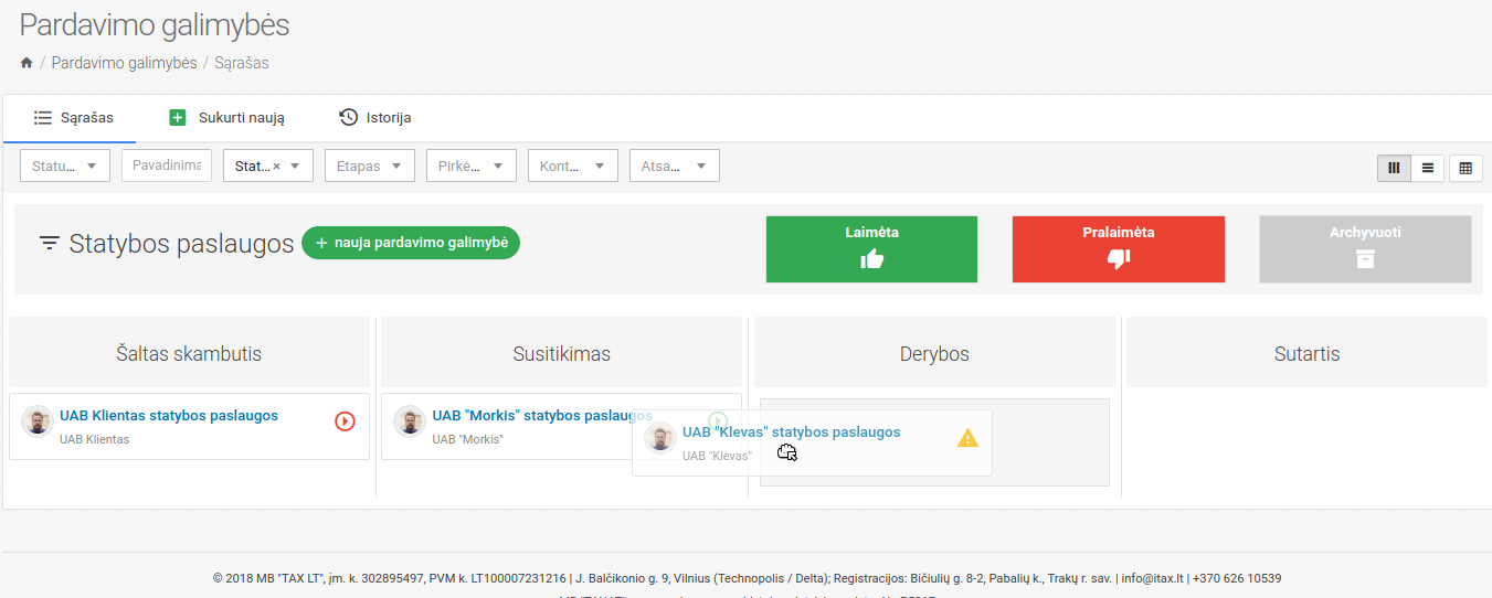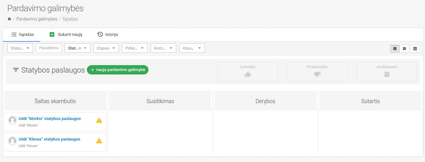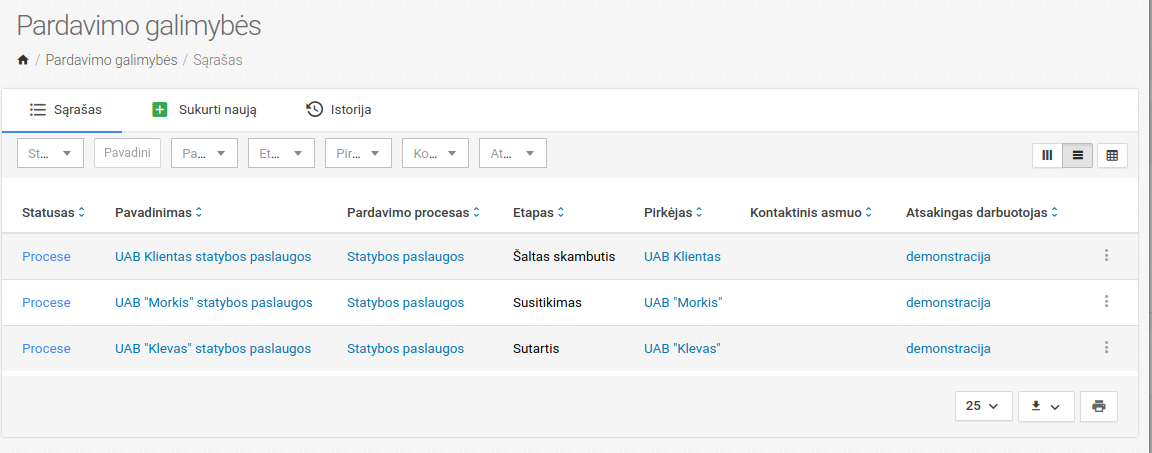 Pardavimo galimybės galima peržiūrėti tiek pagal pardavimo etapus, tiek kaip sąrašą. Langų peržiūra perjungiama mygtukais viršuje dešinėje pusėje.