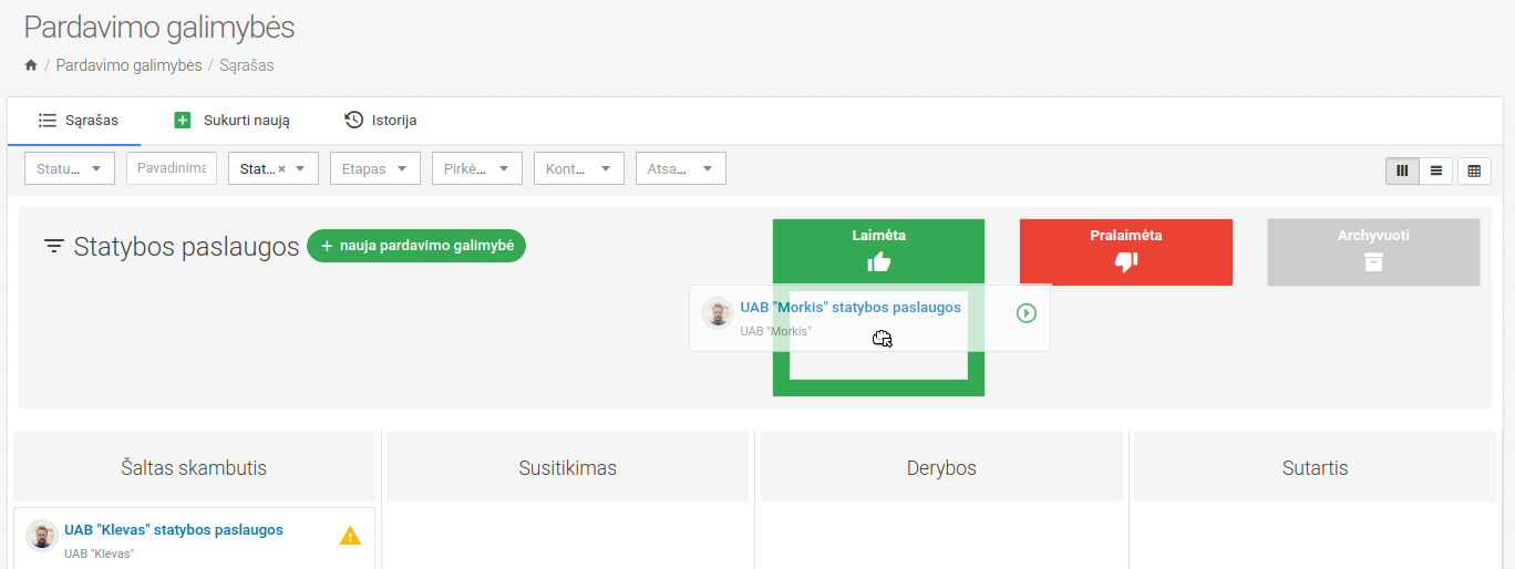 Pardavimo galimybės etapą ar rezultatą keisti galima tiesiog jį perkeliant pele