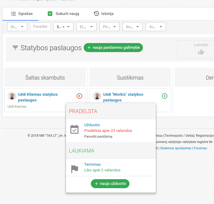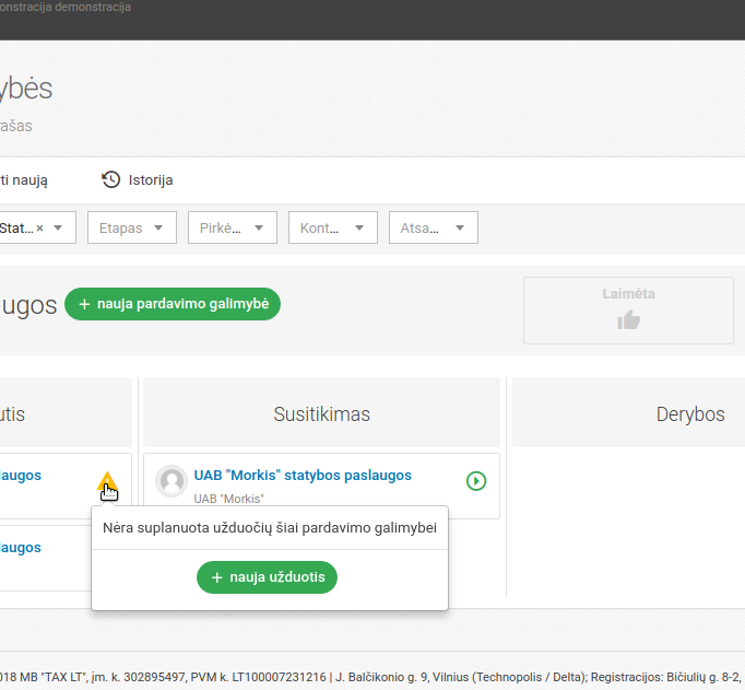 Užduotys pardavimo galimybei kuriamos paspaudus ant nurodyto ženkliuko.