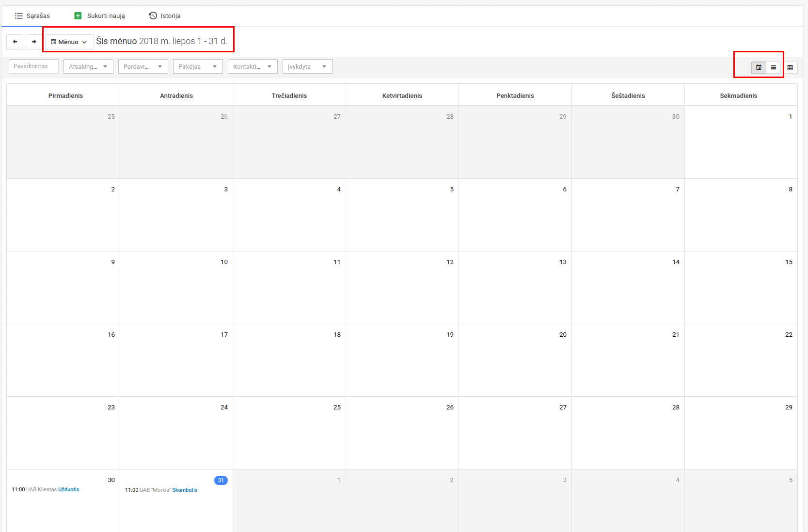 Užduočių sąraše galima matyti suplanuotas užduotis kalendoriuje arba sąraše (peržiūros keitimo mygtukas dešinėje viršuje).