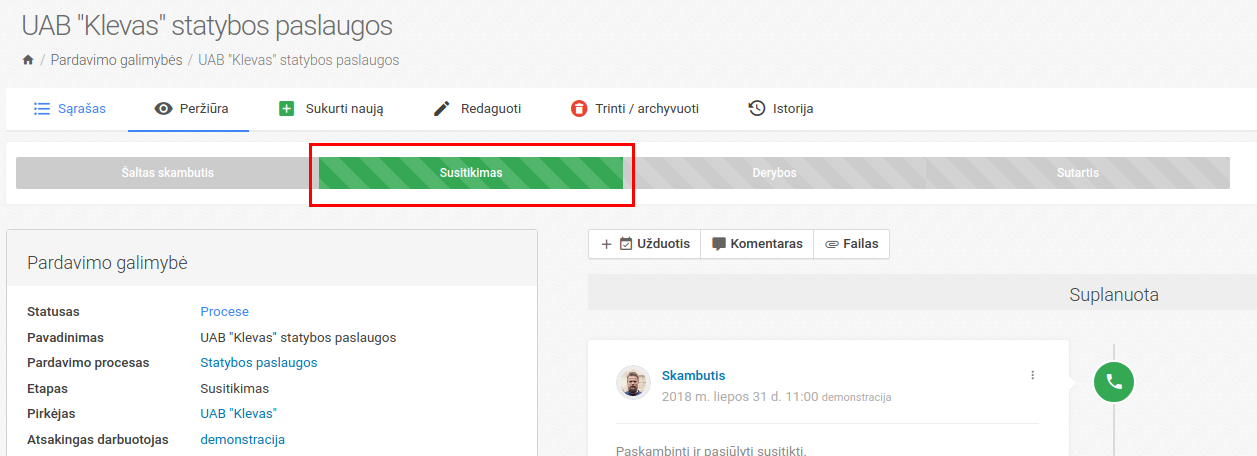 Visa pardavimo galimybės informacija ir istorija ir matoma jos peržiūros lange. Joje galima pridėti komentarus, failus, kurti ar redaguoti esamas užduotis.