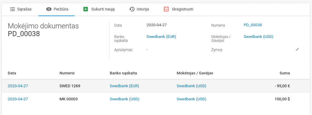 Data - mokėjimo data Banko sąskaita - sąskaita iš kurios mokami / į kurią gaunami pinigai Suma - įveskite teigiamą sumą, jei gaunate pinigus į nurodytą sąskaitą, o neigiamą jei išmokate pinigus iš šios sąskaitos (pvz. atliekate mokėjimą tiekėjui) Rodyti mokėjimo numerį - paspaudus galima įvesti mokėjimo operacijos numerį, jei nėra nustatyta automatinė numeracija Mokėjimo valiuta skiriasi nuo pirminio dokumento - pažymima, jei tiekėjas išrašė sąskaitą užsienio valiuta (pvz. USD), o jūs ją apmokėjote EUR. Žemiau yra išsamesnis aprašymas. Pirkėjas / tiekėjas / banko sąskaita - nurodoma kas bus pinigų gavėjas / mokėtojas Sudengiami įrašai - jei sistemoje yra įvestos neapmokėtos konkretaus pirkėjo / tiekėjo sąskaitos, tai sistema parodys jų sąrašą. Pažymėdami paukščiuką jūs galite sudengti mokėjimą su konkrečia sąskaita (t.y. nurodyti už kurią sąskaitą yra atliekamas mokėjimas) ir kokia suma yra sudengiama (sistema pasiūlo visą likusią sąskaitos sumą).