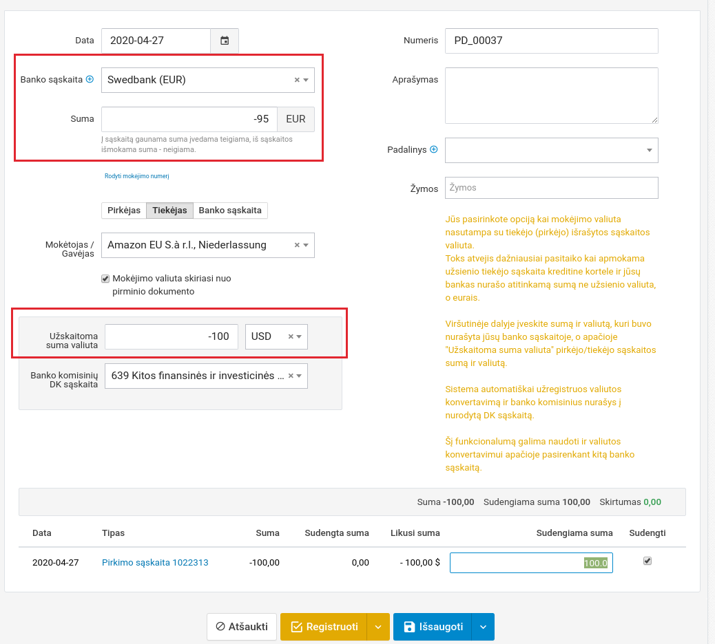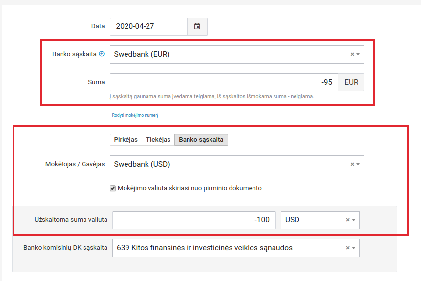 Šiame pavyzdyje tiekėjas išrašė sąskaitą 100 USD sumai. Mes šią sąskaitą apmokėjome kortele ir bankas nuo sąskaitos nurašė 95 EUR. Todėl viršutiniame laukelyje įvedame minus 95 EUR (neigiama, nes ši suma išplaukė iš sąskaitos), o apatiniame laukelyje "Užskaitoma suma valiuta" įvedame sumą USD valiuta, kuri buvo nurodyta apmokamoje sąskaitoje. Banko komisinių DK sąskaitos laukelyje nurodome kur sistema turi užregistruoti banko komisinius už valiutos konvertaciją.