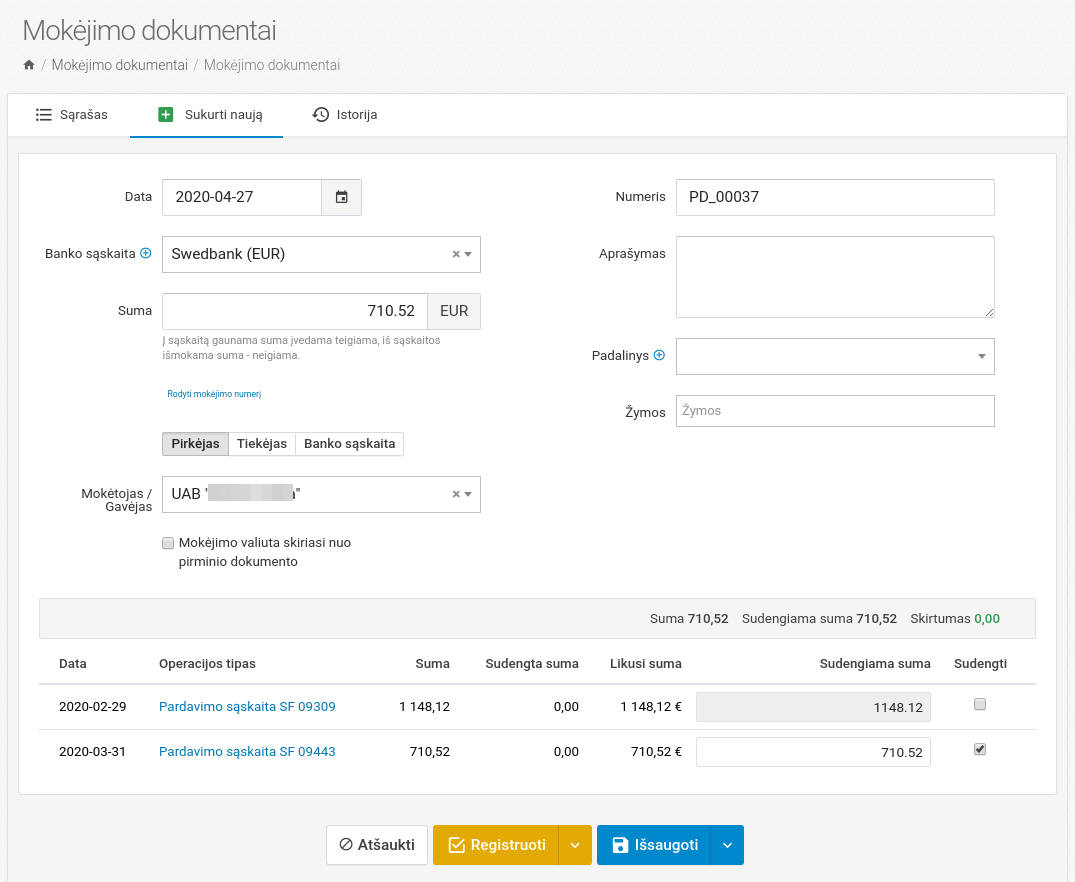 Kuriant naują mokėjimo dokumentą, nurodoma iš kurios / į kurią banko sąskaitą yra mokami pinigai ir kas yra pinigų mokėtojas / gavėjas.