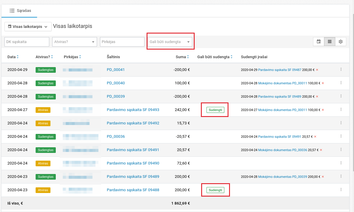 Atsidarykite Pirkėjų knygos įrašus. Pasidarykite matomą stulpelį "Gali būti sudengta". Galite net nufiltruoti tik tuos įrašus, kurie gali būti sudengti, t.y. tas pats pirkėjas turi nesudengtų sąskaitų ir mokėjimų.
