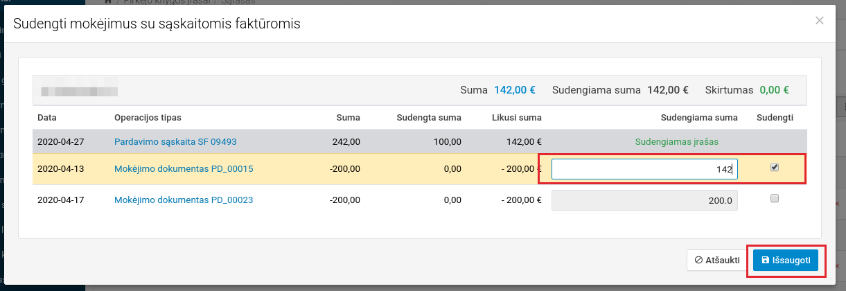 Spauskite mygtuką "Sudengti" ir atsidariusiame lange pažymėkite su kuriuo įrašu yra sudengiama ir pakoreguokite sumą, jei sudengiama ne visa suma.