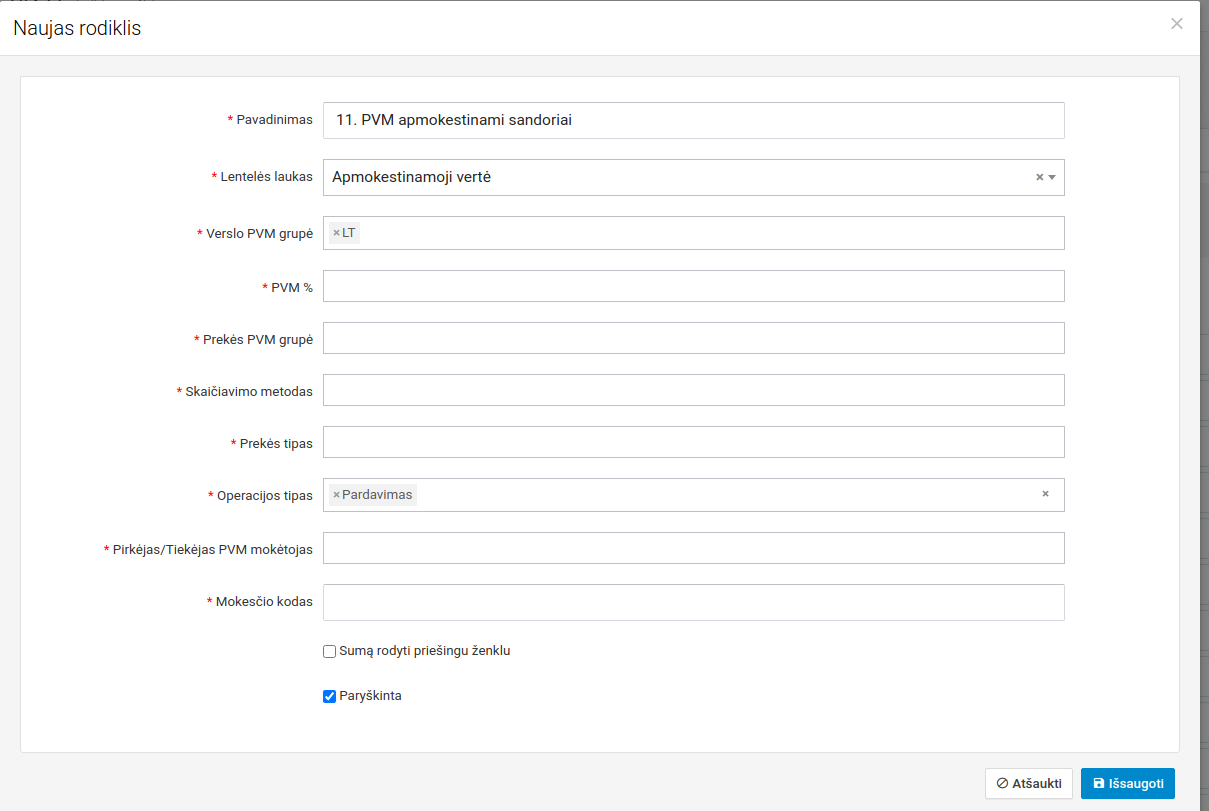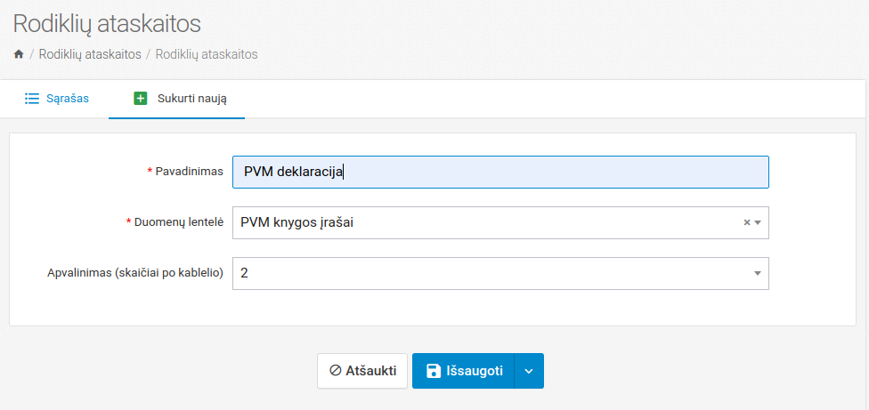 Pavadinimas - ataskaitos pavadinimas Duomenų lentelė - iš kokių duomenų bus generuojami rodikliai Apvalinimas - sistema gali suapvalinti gautą sumą iki nurodytų skaitmenų po kablelio tikslumu