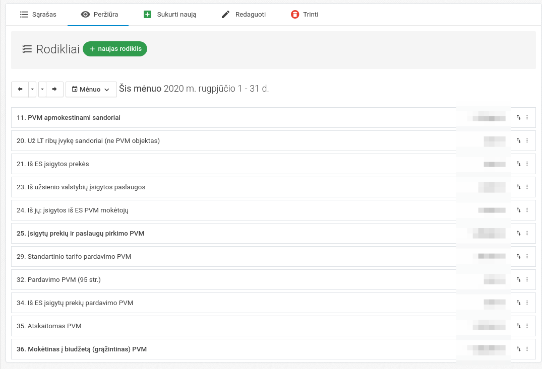 Pavadinimas - rodiklio pavadinimas Lentelės laukas - iš kurio lentelės lauko bus generuojami duomenys Filtrai - nurodomi filtrai, kurie bus skirti šiam rodikliui. Jie gali būti skirtingi visoms lentelėms. Sumą rodyti priešingu ženklu - sistema rodiklį gali atvaizduoti rodiklį priešingu ženklu. T.y. iš neigiamo padaryti teigiamą arba atvirkščiai. Paryškinta - rodiklis bus rodomas ryškesniu šriftu.