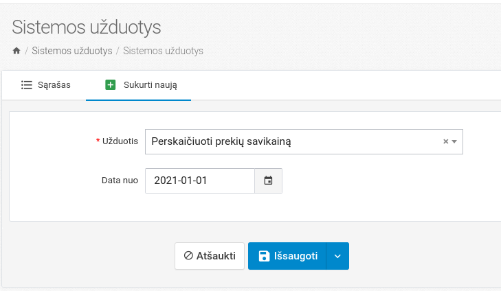 Sistemos užduotys -> Nauja. Perskaičiuoti prekių savikainą